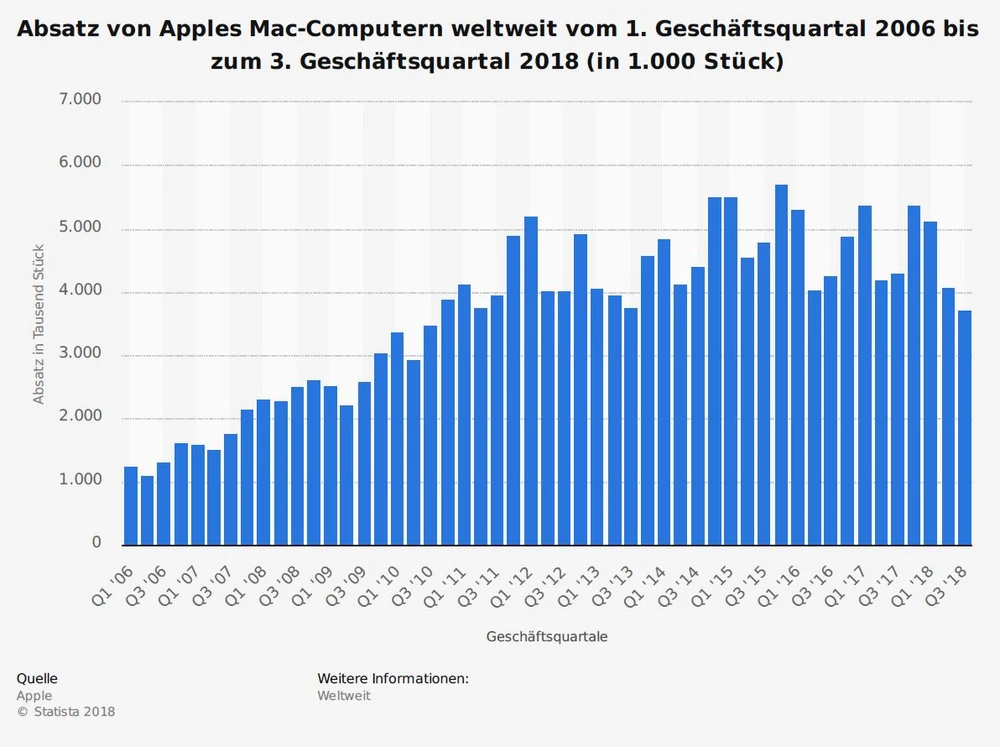 Der Absatz der Mac-Sparte ist seit Monaten rückläufig. 18,3 Millionen Macs hat Apple in den vergangenen vier Quartalen verkauft. Eine vorsichtige Annahme wären somit 16 Millionen für die nächsten vier Quartale, was beim Durchschnittspreis von bis dato 1432 Dollar einem Umsatzpotenzial von 22,9 Milliarden Dollar entspricht.
