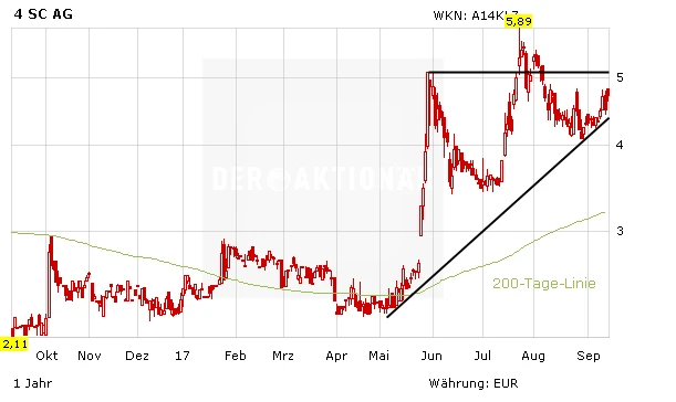 Mit dem heutigen Kurssprung steht die Bodenbildung bei der Aktie von 4SC kurz vor dem Abschluss. Gelingt der Sprung über den Widerstand bei 4,80 Euro und 5,10 Euro rückt das Jahreshoch bei 5,89 Euro wieder in den Fokus. Investierte Anleger bleiben bei dem hochspekulativen Papier an Bord. Größere Rücksetzer, beispielsweise in Richtung 200-Tage-Linie, können hartgesottene Anleger zum Einstieg nutzen.