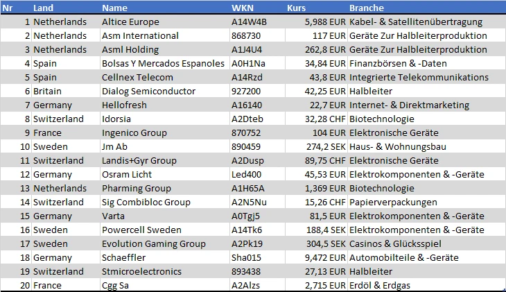 Mit immerhin fünf deutschen Vertretern ist der deutsche Markt im Index dabei gar nicht so schlecht vertreten. Trotz der volkswirtschaftlich eingetrübten Lage gibt es also einige Unternehmen, deren Kurstrend auch im europäischen Vergleich schön nach oben zeigt. Am Ende zählt nahezu unabhängig von der Herkunft natürlich das einzelne Unternehmen.