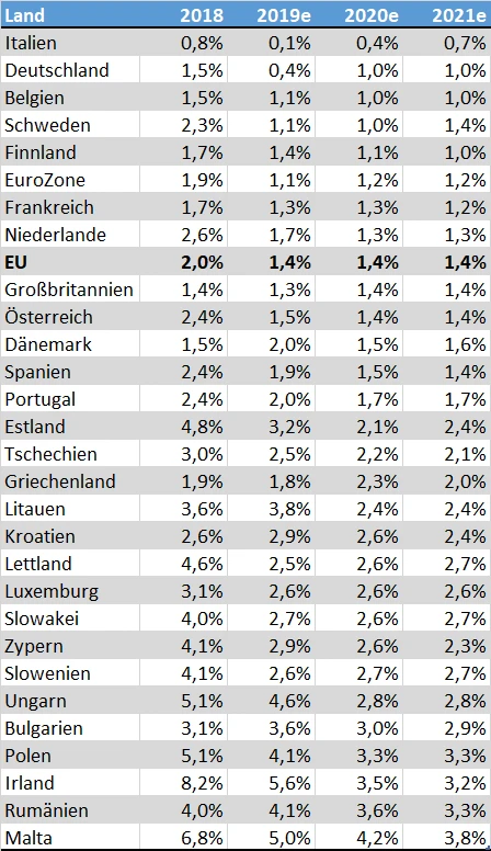 „Italien sei Dank“: Die rote Wachstums-Laterne wird laut Statista-Schätzungen in diesem Jahr wohl knapp an Deutschland vorbei gehen: Ein niedrigeres BIP-Wachstum wird nur in Italien erwartet. Aus Anlegersicht macht ein Blick auf Länder mit stärkerem, volkswirtschaftlichem Rückenwind also Sinn. Auf solche Aktien hinzuweisen und sie bequem investierbar zu machen ist eines der Ziele des E20-Index.