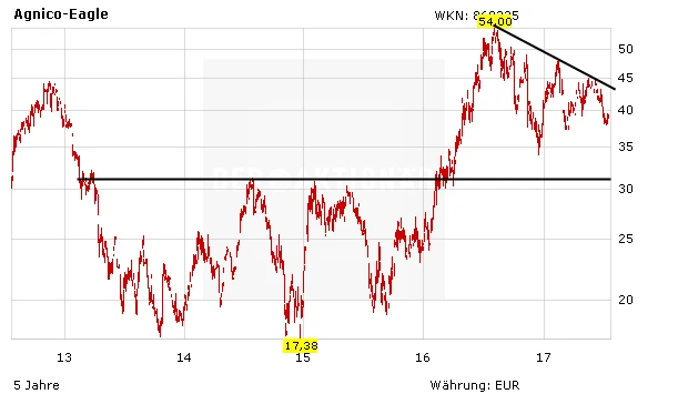 Grund ist die Lapa Mine, deren Lebensdauer bis zum Ende des zweiten Quartals 2017 verlängert werden konnte. Bis ins Jahr 2020 möchte Agnico die zwei Millionen Unzen Marke knacken und den Trend der letzten Jahre bestätigen. Der Unternehmensgewinn belief sich im ersten Quartal auf 76 Millionen Dollar. Das ist eine knappe Verdreifachung zum Vorjahreszeitraum. Pro Aktie wurde eine Quartalsdividende von 0,10 Dollar an die Investoren ausgeschüttet.