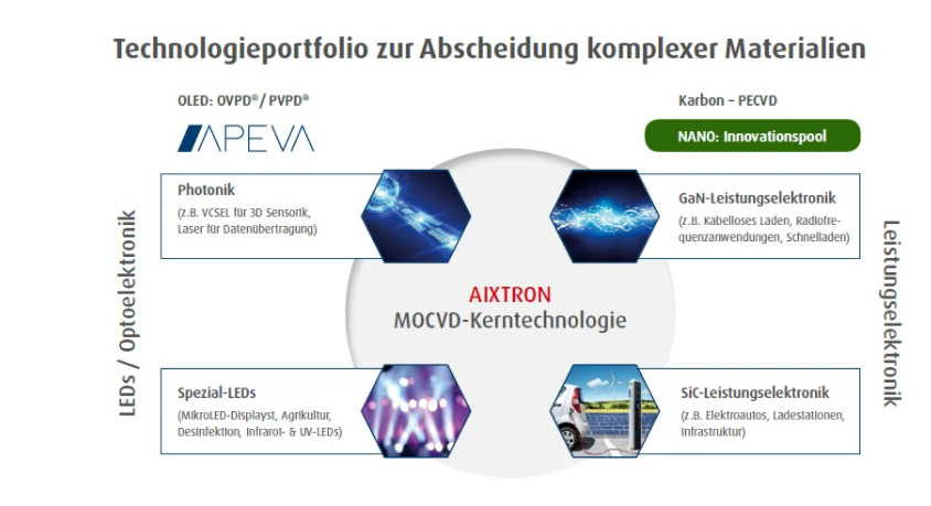 Aixtron verfügt über ein breites Technologieportfolio. Die Aktivitäten der Gesellschaft mit Sitz in Herzogenrath bei Aachen umfassen die Entwicklung, Produktion und Installation von Anlagen für die Abscheidung (Deposition) komplexer Halbleitermaterialien.