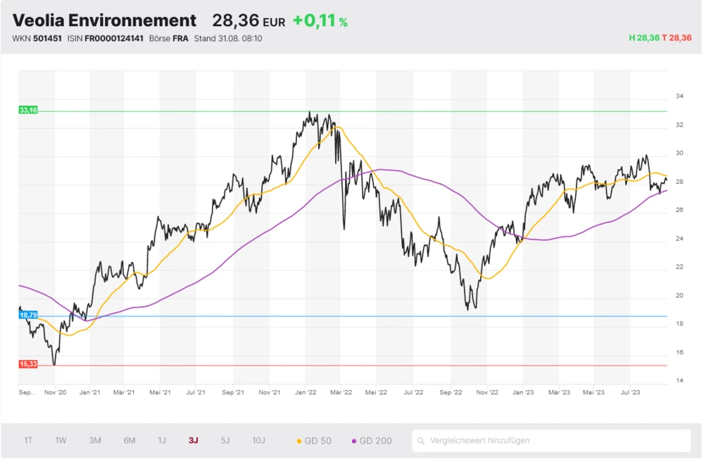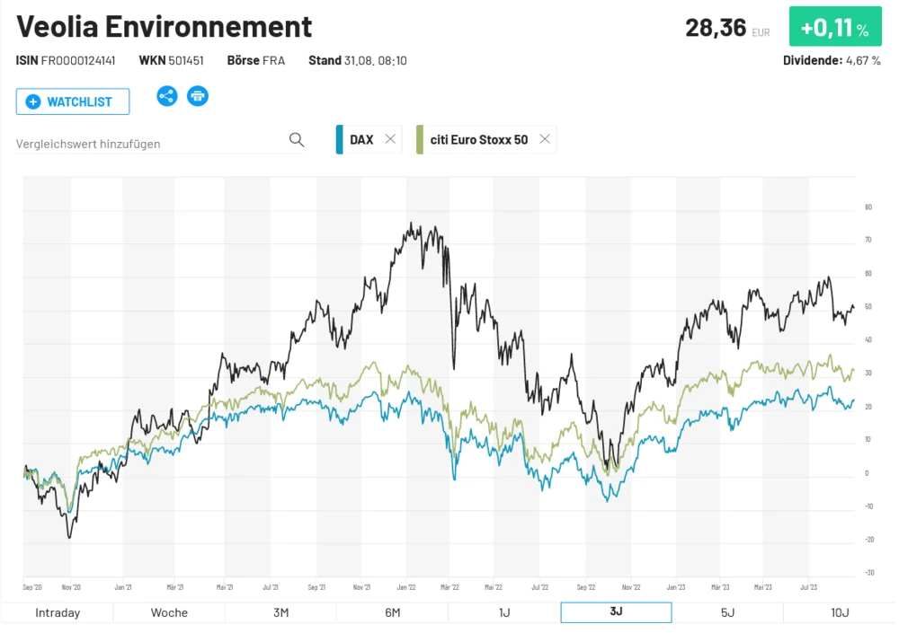 Bei dem europäischen Konzern handelt es sich um Veolia mit den Geschäftsschwerpunkten Wasser, Abwasser, Abfallentsorgung und Energieversorgung. Die Aktie zeigt auf Dreijahressicht sowohl gegenüber DAX als auch gegenüber Eurostoxx 50 eine klare Outperformance von rund 60 Prozent.