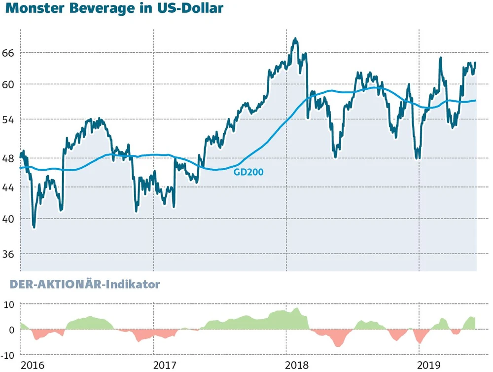 Monster Beverage gehört in dem Sektor zu den trendstärksten Aktien. Bekannt ist der Konzern für seine Energydrinks in schwarzen Dosen mit dem grünen „M“, das an Kratzer eines Raubtieres erinnern soll. So lautet auch der Werbeslogan „Befreie das Ultra-Biest“. Aber nicht nur der erhöhte Koffeingehalt sorgt für einen schnelleren Herzschlag – auch die Performance der Aktie.
