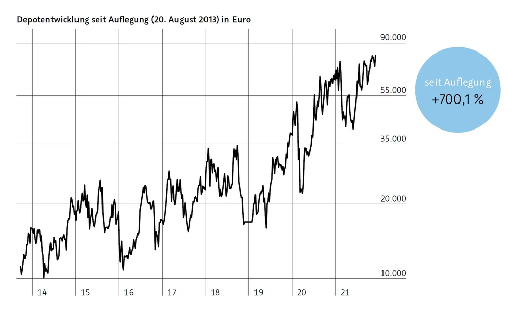 Absolutes Highlight ist jedoch das Aktiendepot. Während im Optionsscheindepot kurzfristige Trends begleitet werden, setzt das 800%-Aktiendepot auf die Devise „weniger ist mehr“. Mit striktem Buy and Hold von Megatrendaktien und sehr wenig Aufwand wurde so in den vergangenen Jahren ein Plus von 250 Prozent erzielt. Highlight im Depot ist Amazon mit einem Buchgewinn von mehr als 1.000 Prozent. Es befinden sich auch noch etliche andere Werte mit deutlich mehr als 100 Prozent Gewinn im Portfolio. Genauso wie im Optionsscheindepot wurde die Performance nach Steuern und Transaktionsgebühren erzielt – in der deutschen Börsenbrieflandschaft nahezu einmalig!
