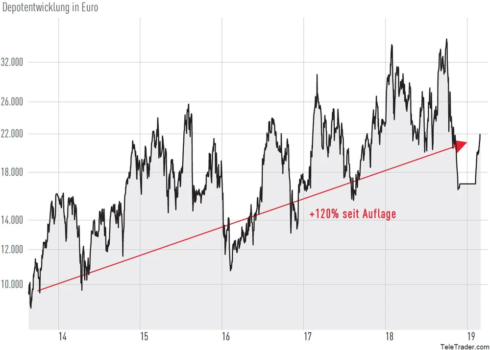 4.450 Euro brachte die 800%-STRATEGIE ihren Lesern innerhalb weniger Wochen ein. Eine Rendite von 26 Prozent. Nach dem Wiedereinstieg in den Markt ging die Renditeentwicklung rasant nach oben. Durch das begleiten solider Trendaktien mit hoch effektiven Optionsscheinen wird das Maximum an Performance herausgeholt.