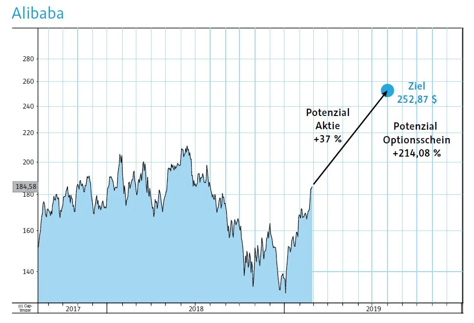 China-Aktien und vor allem Alibaba sind trotz aller Unkenrufe noch lange nicht out! Seit dem Tief Ende Dezember konnte die Aktie bereits über 40 Prozent steigen. Bis zum alten Hoch muss es Alibaba schaffen, darüber sollte wieder eine enorme Aufwärtsdynamik entwickelt werden. Sollte es der Aktie gelingen im nächsten halben Jahr 37 Prozent zu klettern würde der Optionsschein weitere 214 Prozent zulegen. Auch fundamental spricht nichts gegen eine Fortsetzung des Aufwärtstrends. Mit den jüngsten Q4-Zahlen hat Alibaba eindrucksvoll seine Vormachtstellung bewiesen.