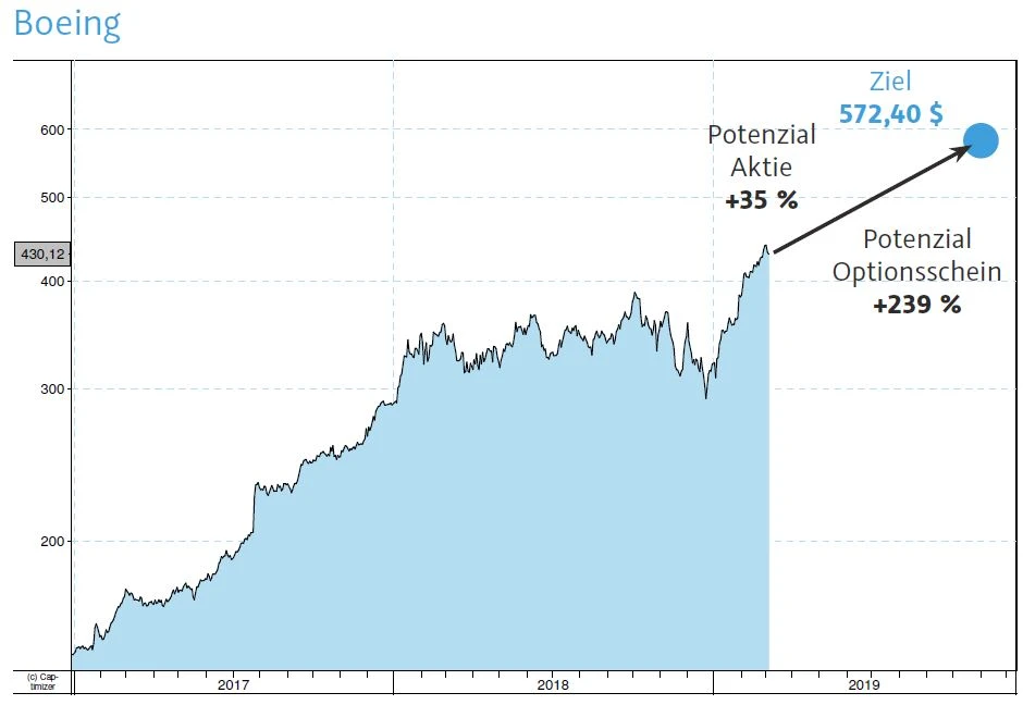 Ein Musterbeispiel einer Aktie die bereits über einen beeindruckenden Aufwärtstrend verfügt ist Boeing. Seit 2017 ist die Aktie bereits über 180 Prozent gestiegen. Ein Ende des Aufwärtstrends ist noch lange nicht in Sicht. Auch fundamental ist Boeing hervorragend aufgestellt. Wenn man die Prognosen des Airline-Verbands IATA untersucht ist auch kein Anlass gegeben, dass sich dies in Zukunft ändern könnte. Sollte die Dynamik des Trends weiter anhalten, hat der Optionsschein extrem hohes Potenzial.