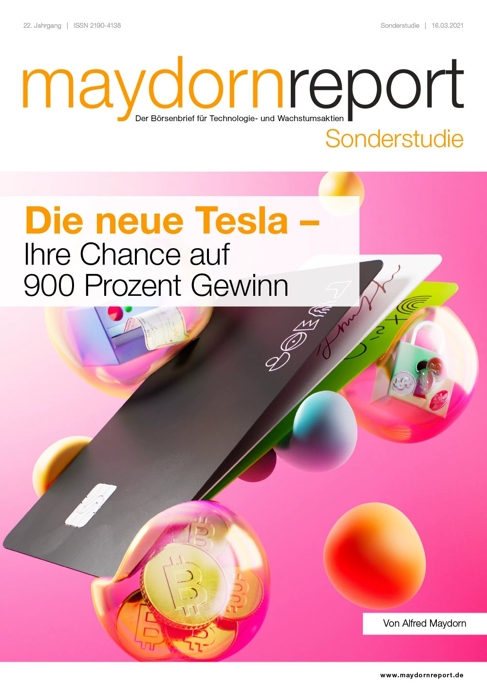 Die neue Sonderstudie „Die neue Tesla – Ihre Chance auf 900 Prozent Gewinn“ ist exklusiv für die Leser des maydornreport erstellt worden. Sollten Sie noch kein Leser des maydornreport sein, dann werden Sie es doch einfach. Sie erhalten dann mit der Bestellbestätigung umgehend die neue Sonderstudie in ihr E-Mail-Postfach.