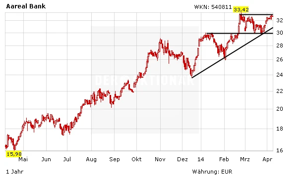 So notiert der Kurs nur noch knapp unter der Marke von 33,40 Euro. Nachdem die Aareal-Bank-Aktie an diesem Widerstand Ende Februar zuletzt noch gescheitert war, glückte im frühen Handel der Sprung über diese wichtige Hürde. Kann sich der Kurs darüber behaupten, wäre das nächste Kaufsignal perfekt. Der Weg nach oben wäre dann vorerst frei.