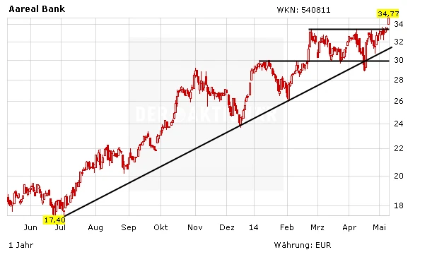 Die Aktie der Aareal Bank setzt ihren Höhenflug fort. Im heutigen Handel markiert das Papier des Wiesbadener Immobilienfinanzierers ein neues Mehrjahreshoch, nachdem zuvor ein hartnäckiger Widerstand aus dem Weg geräumt werden konnte. Die weiteren Aussichten für den MDAX-Titel sind nun weiterhin sehr gut.