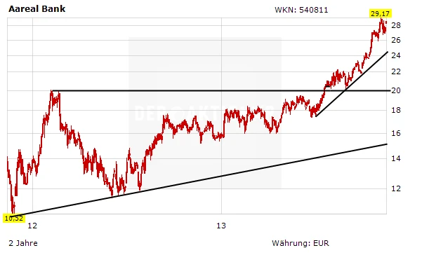 DER AKTIONÄR hält nach wie vor an seiner Kaufempfehlung für die Aareal Bank fest. Der gut geführte Immobilienfinanzierer verfügt über eine starke Marktstellung und eine solide Bilanz. Da es auch aus charttechnischer Sicht gut aussieht, bleibt der MAX-Wert ein Kauf. Bereits investierte Anleger sollten den Stoppkurs zur Gewinnsicherung auf 20,00 Euro nachziehen.