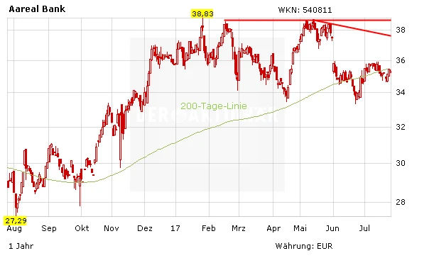 Obwohl die Bilanzqualität der Aareal Bank über jeden Zweifel erhaben ist, notiert die Aktie mit 0,8 unter dem Buchwert. Im Gegensatz zur Gesamtbranche, die auf 1,8 kommt, ist das eine deutliche Unterbewertung. Auch das KGV liegt mit 9,6 leicht unter dem Vergleichswert von 10,4. Weiterhin spricht außerdem die hohe Dividendenrendite von 5,7 Prozent für das Papier. DER AKTIONÄR empfiehlt die Aktie zum Kauf und gibt ein Kursziel von 45,00 Euro aus. Ein Stopp sollte bei 33,00 Euro platziert werden.