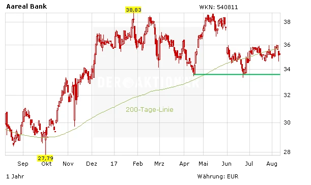 Die Aareal Bank ist eines der solidesten Finanzinstitute in Deutschland. Die Aktie ist mit einem KGV von 11 im Vergleich zur Peergroup deutlich unterbewertet (15). Auch das Kurs-Buchwert-Verhältnis von 0,8 hat einen größeren Abschlag zur Konkurrenz (1,8). Die attraktive Dividendenrendite von 5,7 Prozent rundet das positive Gesamtbild ab. Aus charttechnischer Sicht sollte bald die Kurslücke vom 6. Januar diesen Jahres bei 35,20/37,50 Euro geschlossen werden. Eine Unterstützung befindet sich um 33,50 Euro.