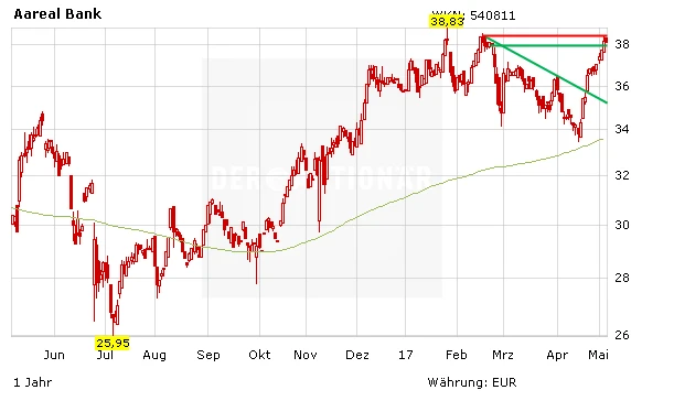 Die Aktie der Aareal Bank hat mit dem Sprung über den mittelfristigen Abwärtstrend bei 36,95 Euro erst jüngst ein neues Kaufsignal generiert. Die nächsten Widerstände liegen jetzt bei 38,51 und 39,65 Euro. Werden diese Hürden genommen, ist der Weg bis zur psychologisch wichtigen Marke von 40,00 Euro frei. Charttechnisch gibt es dann auch keine Barrieren mehr bis zum Kursziel des AKTIONÄR von 45,00 Euro. Eine Unterstützung befindet sich in Höhe von 38,00 Euro. Wer investieren möchte, sollte bei 31,00 Euro einen Stopp platzieren.