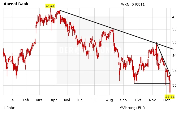 Mit einem 2015er-KGV von 6 (2016 dürfte es ohne positive Sondereffekte bei 9 liegen), einem KBV von 0,7 und einer Dividendenrendite von 4,8 Prozent ist die Aktie der Aareal Bank, die über eine starke Marktstellung, eine solide Bilanz und ein starkes Management verfügt, ein absolutes Schnäppchen. Wegen des angeschlagenen Chartbildes sollte vor einem Neueinstieg jedoch noch eine Bodenbildung abgewartet werden. Wer bereits investiert ist, beachtet den Stopp bei 26,50 Euro.