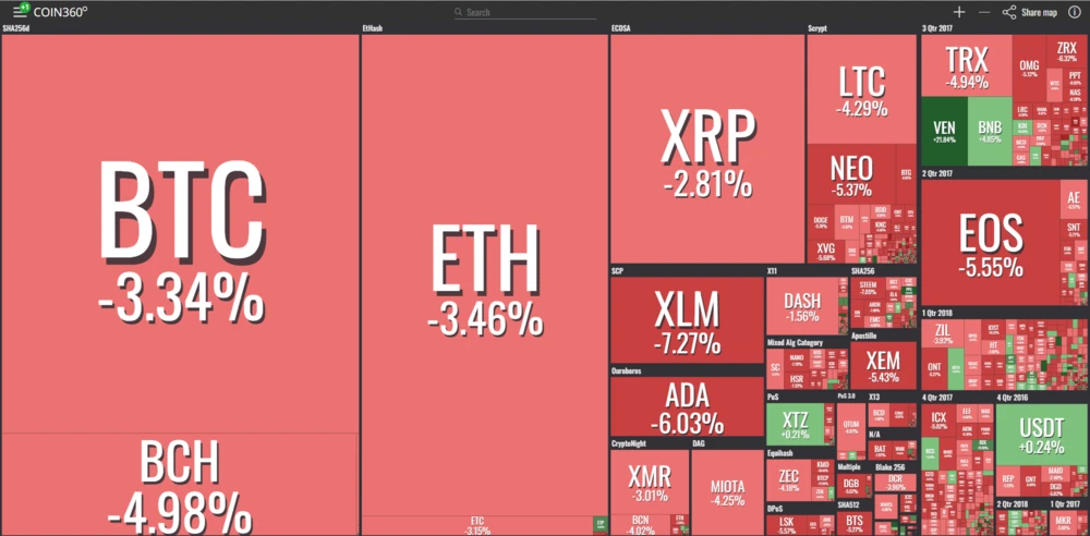 Dem Kryptomarkt schmeckt das gar nicht: Unter den Top 100 nach Marktkapitalisierung dominieren am Freitagvormittag klar die roten Vorzeichen. Selbst der Bitcoin, der in den vergangenen Tagen mit relativer Stärke geglänzt hatte, verliert über drei Prozent und fällt dabei unter die Marke von 8.000 Dollar zurück. Nach dem starken Lauf der letzten Wochen ist der Rücksetzer jedoch kein Grund zur Panik, zumal auf Wochensicht trotzdem noch ein Plus von rund sieben Prozent zu Buche steht. Spätestens die charttechnische Unterstützung im Bereich von 7.700 Dollar sollte nach unten Halt geben.