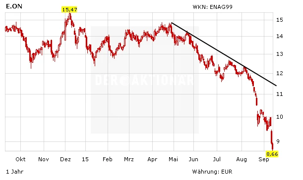 Mit der neuen Hiobsbotschaft setzt sich die Krise bei E.on weiter fort. Seit Jahresbeginn hat die Aktie so schon 40 Prozent an Wert verloren, alleine im vergangenen Monat steht ein Minus von 30 Prozent zu Buche. Ein Ende der Talfahrt ist jedoch weiterhin nicht in Sicht. Der Konzern kämpft mit zahlreichen Problemen im operativen Geschäft. Die hohen Schulden, die anhaltenden Probleme in der Bewältigung der Energiewende und der anstehende Konzernumbau belasten. Auch charttechnisch sind inzwischen alle Unterstützungen gerissen.