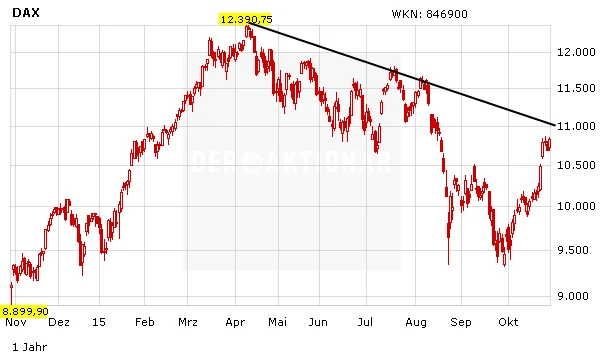 Wenn der DAX nun jedoch nach unten dreht, wird der mittelfristige Abwärtstrend erneut bestätigt – und dann droht uns im DAX ein schneller massiver Kursrutsch bis auf die alten Tiefs bei 9.300 Punkten. In diesem Fall war der gesamte Anstieg im Oktober nichts anderes als ein Short-Squeeze von Leerverkäufern und eine Gegenreaktion im gültigen Abwärtstrend.