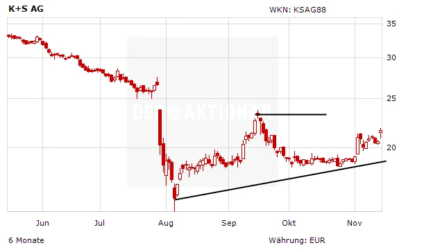 Equinet hat nach den Zahlen das Kursziel für K+S von 47 auf 23 Euro mehr als halbiert, die Kaufempfehlung aber bestätigt. Das alte Kursziel stammte noch aus der Zeit vor dem Zusammenbruch der dominierenden Kali-Vertriebsallianz Ende Juli. Das dritte Quartal habe gute Ergebnisse geliefert und der Ausblick sei "okay", so Analyst Michael Schäfer in seiner jüngsten Studie. Durch den Ausbruch aus den Seitwärtstrend hat die Aktie ein kurzfristiges Kaufsignal generiert. Aus charttechnischer Sicht sollte die Aktie das Zwischenhoch bei 23,70 Euro ins Visier nehmen.