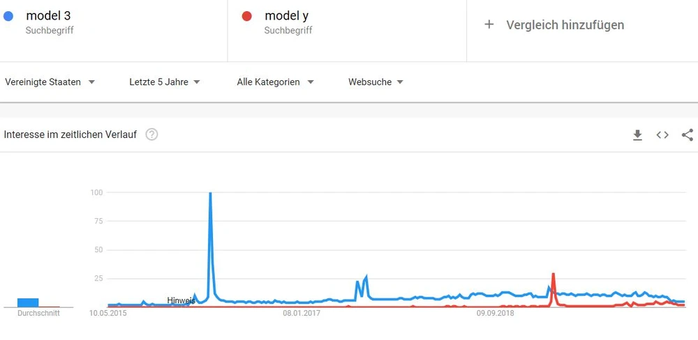 Elektroauto-Fans können sich freuen: In den Startlöchern stehen derzeit so viele spannende E-Autos wie nie. Tesla schickt den Model-3-Bruder Model Y ins Rennen. Das Interesse (siehe Grafik) daran ist groß, doch ein Hype wie um das Model 3 ist bislang nicht erreicht. Während das Model 3 zur Vorstellung 2016 quasi konkurrenzlos dynamisch war, streitet sich Tesla nun erstmal mit starken Rivalen um die Kunden.