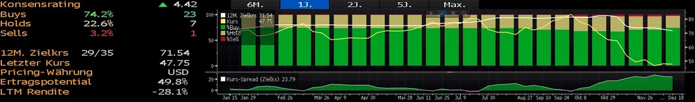 Von 31 Analysten, welche Activision Blizzard covern, empfehlen 23 den Kauf, 7 eine Halte-Position und bloß einer rät zum Verkauf. Das durchschnittliche Kursziel liegt bei 71,54 Dollar, was einem Ertragspotenzial von 49,8 Prozent entspricht.