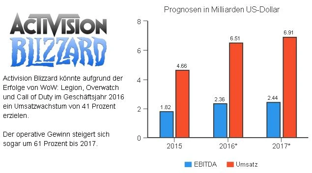 Im Vergleich zum Vorjahr meldete Activision Blizzard ein Umsatzwachstum von 58 Prozent auf 1,6 Milliarden Dollar. Der Gewinn je Aktie übertraf die Erwartungen der Analysten um Längen. Erwartet wurde ein Gewinn von 0,06 Dollar je Aktie – der Konzern lieferte jedoch 0,26 Dollar je Aktie ab.