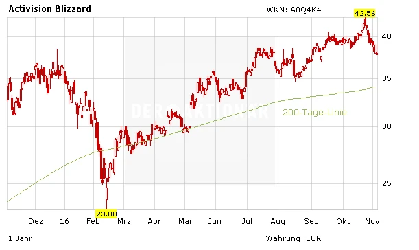 Nachdem die Activision Blizzard Aktie in den vergangenen zwei Wochen korrigierte, drehte das Papier nach den starken Quartalszalen wieder nach oben. Die Aktie konnte in den letzten acht Monaten um 65 Prozent zulegen. Der durchschnittlich erwartete Zielkurs der Analysten liegt bei 50 Dollar – dies würde einem Kursgewinn von 16 Prozent entsprechen.