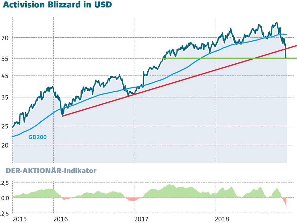 Ein möglicherweise schwaches Call of Duty und der Aufschrei der Spieler aufgrund des Mobile-Games Diablo Immortal – die Aktie von Activision Blizzard bleibt im Abwärtstrend gefangen. Mittelfristig verabschiedet DER AKTIONÄR sich von der Aktie. Der Stopp bei 55,00 Euro ist erreicht – die Position wurde mit einem Plus von knapp 19 Prozent verkauft. Bevor sich der anhaltende Abwärtstrend nicht dreht, sollten Anleger nicht ins fallende Messer greifen.