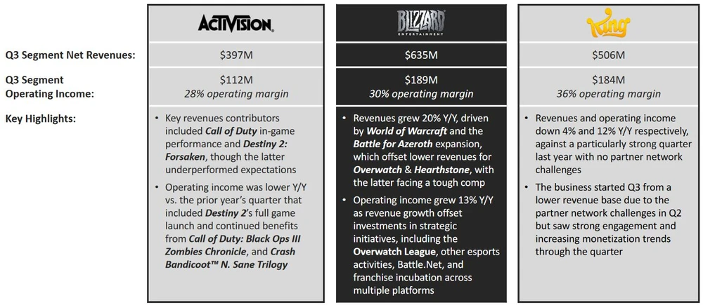 Problematisch sehen die Analysten dagegen die Zahl der monatlich aktiven Nutzer. Diese sank von 352 Millionen auf 345 Millionen herab. Der dritte Verlust in drei aufeinanderfolgenden Quartalen. Schwach waren Destiny 2 und Hearthstone – zudem lieferte der eigentliche Nutzergarant King Mobile kein zusätzliches Wachstum. Auf die Nutzerzahlen legen Investoren jedoch mittlerweile besonderen Wert.