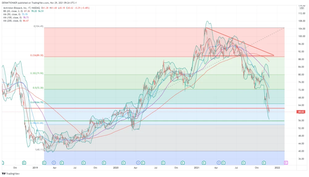 Im Vorfeld des Sexismus-Skandals konsolidierte die Activision-Blizzard-Aktie über die Sommermonate in Form einer abfallenden Dreiecksformation. Ende Juli löste sie diese nach unten auf, indem sie die untere Begrenzung, die parallel zur 200-Tage-Linie bei rund 90 Dollar verlief, unterschritt. Seitdem geht es für den Wert stetig bergab. Selbst wichtige Unterstützungen wie das Doppel-Top bei rund 86 Dollar und die Horizontale bei 75 Dollar konnten keinen Halt bieten.
