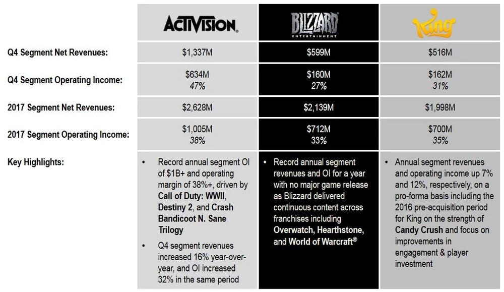 Geht man nach den Zahlen, ist der Mobile-Entwickler King jedoch der wahre Lichtblick in der Bilanz. Die Umsätze im Mobile-Segment zogen gegenüber dem Vorjahresquartal um 18 Prozent auf 516 Millionen Dollar an. King versuchte im abgelaufenen Jahr vermehrt Werbung in ihre Handyspiele einzubauen. Für 2018 erwartet der Entwickler erste Ergebnisse im Rahmen einen unternehmensweiten Mobile-Pipeline.