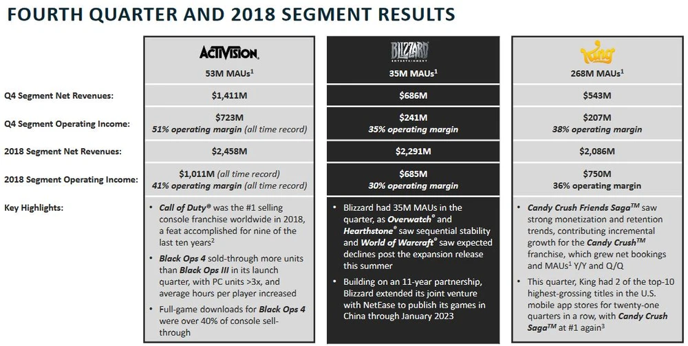 Activision Blizzard gehört mit „Candy Crush“ das erfolgreichste Mobile-Franchise – was sich auch deutlich in der Bilanz zeigt. Im vierten Quartal erzielte der Konzern hier 543 Millionen Dollar bie einer operativen Marge von 38 Prozent.