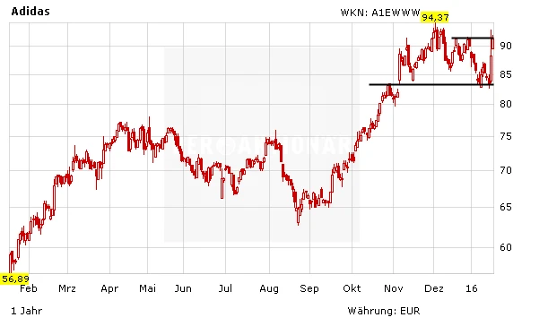Die Analysten von Equinet haben den DAX-Titel mit einem „Buy“-Rating und Kursziel 102 Euro wieder in die Bewertung aufgenommen. Credit Suisse – bislang nicht gerade optimistisch für Adidas gestimmt – hat die Aktie von „Underperform“ auf „Neutral“ hochgestuft und das Kursziel von 80 auf 90 Euro angehoben.