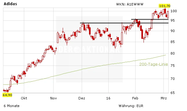 Am Mittag erhöhte die Credit Suisse ihr Kursziel für die Adidas-Aktie von 87 auf 92 Euro. Die Einstufung der Bank lautet weiterhin „Halten“. Die von der Nachrichtenagentur Bloomberg befragten Experten sind bezüglich des Wertes überwiegend positiv gestimmt. 22 Analysten raten zum Kauf, 18 votieren „Halten“ und nur vier sagen „Verkaufen“. Mit den positiven Impulsen im Rücken dürfte es nur eine Frage der Zeit sein, bis die Aktie die psychologisch wichtige Marke bei 100 Euro überwindet. Das Allzeithoch befindet sich in unmittelbarer Nähe. Sollte das Papier über die Marke bei 101,57 Euro steigen, wäre der Weg nach oben frei. Nach unten sichert eine Unterstützung bei 95,62 Euro ab. Der langfristige Aufwärtstrend ist weiterhin intakt.