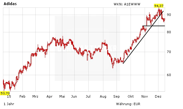 Aus charttechnischer Sicht ist das Bild bei Adidas damit weiterhin im grünen Bereich. Der seit Mitte September gültige Aufwärtstrend wurde zwar im Rahmen der Konsolidierung gebrochen. Allerdings ist die horizontale Unterstützung bei gut 83,50 Euro weiterhin intakt, da die Aktie die Trendwende sogar bereits im Bereich der 86-Euro-Marke vollzog. Nach oben wäre der Weg bis zum Allzeithoch nun frei. Gelingt der Sprung über diese Marke, winken noch weitere Gewinne.