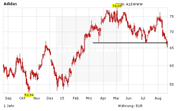 Noch zu Jahresbeginn hat sich die Aktie von Adidas deutlich erholen können. Anfang August sah es sogar so aus, als könnte das Papier das Jahreshoch, das im Mai dieses Jahres bei 78,05 Euro markiert wurde, überwinden. Dann ging der Aktie jedoch die Luft aus. Im Zuge der allgemeinen Marktschwäche geriet Adidas erheblich unter Druck und rutschte dabei zwischenzeitlich auch unter die Unterstützung bei 66,63 Euro. Am heutigen Freitag hat sich das Papier aber wieder leicht erholen können. Adidas ist mit einem Plus von 0,5 Prozent auf 66,65 Euro der Top-Gewinner im DAX. Ohnehin notieren am frühen Nachmittag nur vier Werte im deutschen Leitindex im grünen Bereich. Neben Adidas ist das Henkel, Infineon und K+S.