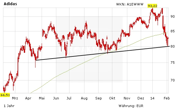 DER AKTIONÄR sieht in den jüngsten Kursverlusten eine gute Kaufgelegenheit. Die Adidas-Aktie dürfte schon bald ihren Aufwärtstrend fortsetzen. Ein Stopp sollte bei 76,50 Euro gesetzt werden.