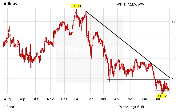 Achtet man bei der Adidas-Aktie derzeit nur auf den Kursverlauf, so kann der Titel die Anleger tatsächlich nicht begeistern. Doch zu Beginn des zweiten Halbjahres lohnt sich ein genauerer Blick auf den Herzogenauracher Konzern. Mit dem Erfolg der deutschen Nationalmannschaft bei der WM in Brasilien, den neuen Rekordzahlen beim Absatz des WM-Balls Brazuca oder auch dem neuen langfristigem Millionen-Deal mit dem Premier-League-Giganten Manchester United sorgt vor allem das Fußball-Geschäft für Freude bei Konzern-Chef Herbert Hainer. Diese positive Entwicklung sollte sich in Kürze auch in den Zahlen widerspiegeln. Dann dürfte auch die Talfahrt der Aktie ein Ende finden.