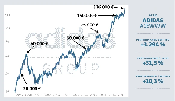Der Börsengang der Adidas AG erfolgte schließlich im November 1995. Der Ausgabepreis betrug umgerechnet rund 9,63 Euro. Wer zum Börsengang 10.000 Euro in Adidas investiert hätte, besäße heute ein Vermögen in Höhe von 330.000 Euro (Stand 15.05 siehe Hinweis unten)