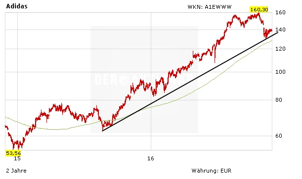 Spannendes Chartbild bei Adidas: Die Aktie hat einen Aufwärtstrend gebildet, der seinen Anfang im August 2015 nimmt. Aktuell verläuft er bei 133,50 Euro, während die Aktie bei 138,57 Euro notiert. Wird er gebrochen, rückt als nächste Unterstützung die 200-Tage-Linie in den Fokus. Diese verläuft momentan bei 128,47 Euro. Der nächste nennenswerte Widerstand wartet auf Adidas erst bei 160,30 Euro, dem Allzeithoch im Oktober.