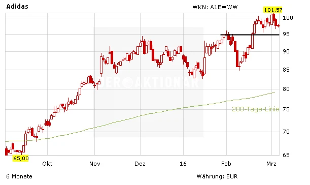 Auch Analyst Graham Renwick von der französischen Investmentbank Exane BNP Paribas revidierte seine Schätzungen nach dem aktuellen Geschäftsbericht nach oben. Die Bewertung der Papiere des Herzogenauracher Sportartikelkonzerns sei weiter nicht sonderlich hoch. Deshalb lautet sein Votum „Outperform“. Der Experte sieht die Aktie nun bei 110 Euro (vorher 105 Euro) fair bewertet.
