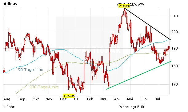 Unterdessen hat sich das Chartbild der Adidas-Aktie merklich verbessert. Der Titel hat die 200-Tage-Linie hinter sich gelassen und nimmt wieder langsam Kurs auf die 200-Euro-Marke.