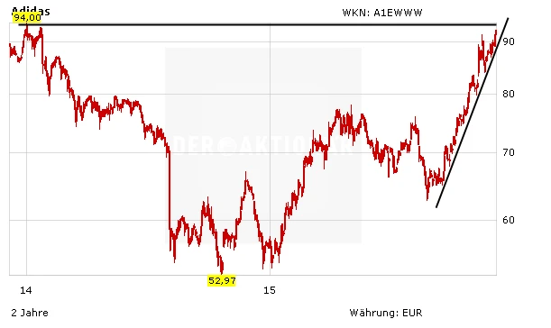 Seit Ende September befindet sich die Adidas-Aktie wieder im Aufwind – rund 35 Prozent hat der DAX-Titel seitdem zugelegt. Mittlerweile kratzt der Kurs am Allzeithoch von 93,22 Punkten. Gelingt ein Ausbruch über diese Marke, sind dreistellige Kurse nur noch eine Frage der Zeit.