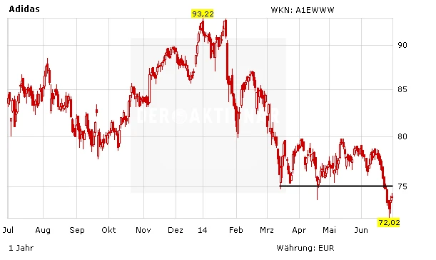 Die charttechnische Situation der Adidas-Aktie hat sich mit dem Bruch der horizontalen Unterstützung bei der 75-Euro-Marke eingetrübt. Auch die Fußball-WM in Brasilien konnte für den DAX-Konzern bisher keine neuen Impulse bringen. DER AKTIONÄR rät den Anlegern daher weiterhin abzuwarten und nicht ins fallende Messer zu greifen.