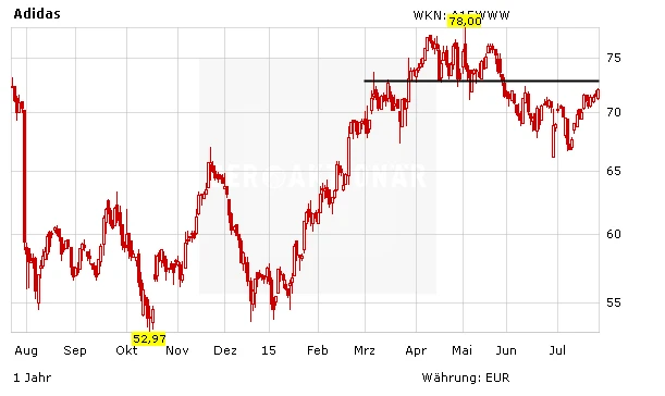 Adidas hat nach wie vor nicht alle Schwierigkeiten überwunden. Dennoch hat sich das Bild nach dem schwachen Jahr 2014 wieder aufgehellt. Charttechnisch wartet die nächste Hürde beim Widerstand bei 73 Euro. Für den AKTIONÄR bleibt der DAX-Titel eine Halteempfehlung, der Stoppkurs liegt bei 57,80 Euro.