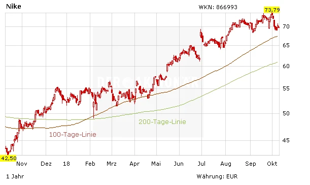 Diese soliden Wachstumsraten kann Nike, ein Langfrist-Favorit des AKTIONÄR, sogar übertreffen. Die Zahlen zum ersten Quartal, die Nike Ende September veröffentlichte, lagen erneut über den Schätzungen der Analysten. Der Umsatz legte um zehn Prozent gegenüber dem Vorjahresquartal auf 9,95 Milliarden Dollar zu – erwartet wurden nur 9,94 Milliarden Dollar. Am stärksten legte das Segment Nike Digital zu – hier verzeichnete der Konzern einen Zuwachs von 36 Prozent.