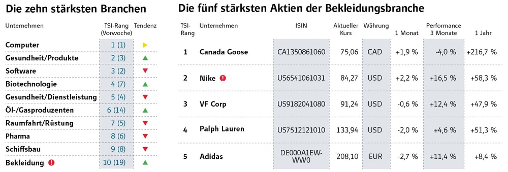 Die Bekleidungsbranche kämpfte sich vergangene Woche im TSI-Ranking von Platz 19 auf Platz 10 hoch und gehört damit wieder einmal zu den zehn trendstärksten Branchen der Welt. Bei den Einzelaktien der Branche haben Adidas und Nike die Nase vorne.