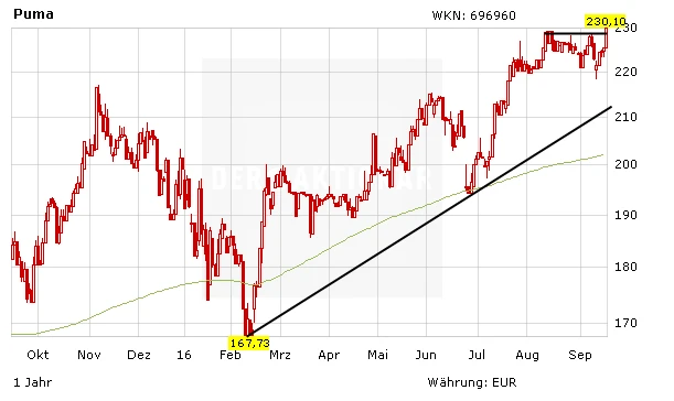 Die Puma-Aktie legt am Freitag um 4,5 Prozent auf 235,50 Euro zu und gehört damit zu den Top-Gewinnern am Aktienmarkt. Mit dem Kurssprung klettert die Aktie auf den höchsten Stand seit Ende 2013. Der Ausbruch über die Marke von 230 Euro, die zuletzt zweimal einen weiteren Anstieg ausgebremst hatte, habe offensichtlich neue Käufer angelockt.