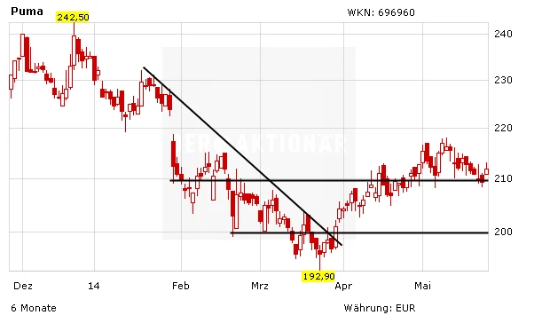 Die Puma-Aktie geriet Anfang des Jahres unter die Räder. In den vergangenen Wochen übernahmen dann wieder die Bullen das Steuer. Im Bereich der 210-Euro-Marke hat sich ein horizontale Unterstützung herausgebildet. Rutscht die Aktie unter dieses Kursniveau, wird ein neues Verkaufssignal ausgelöst und es droht ein weiterer Abverkauf bis zur 200 Euro.